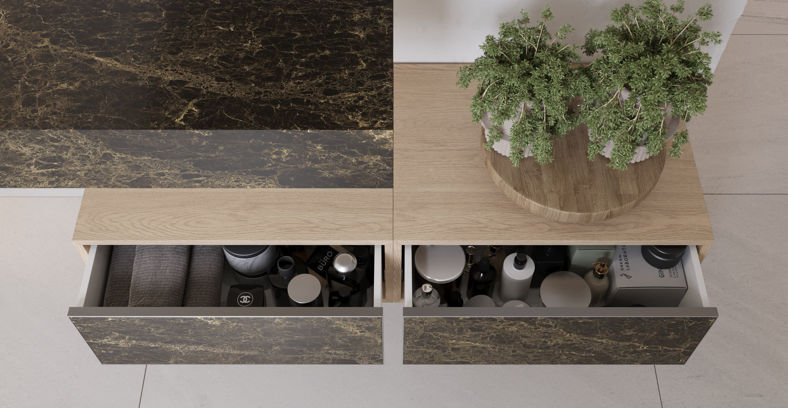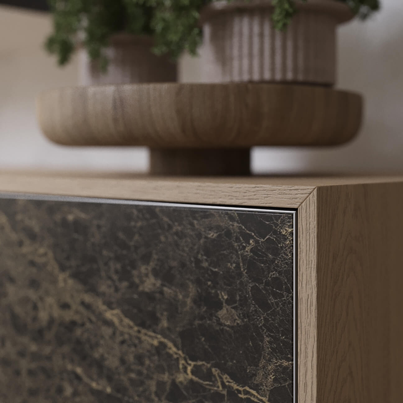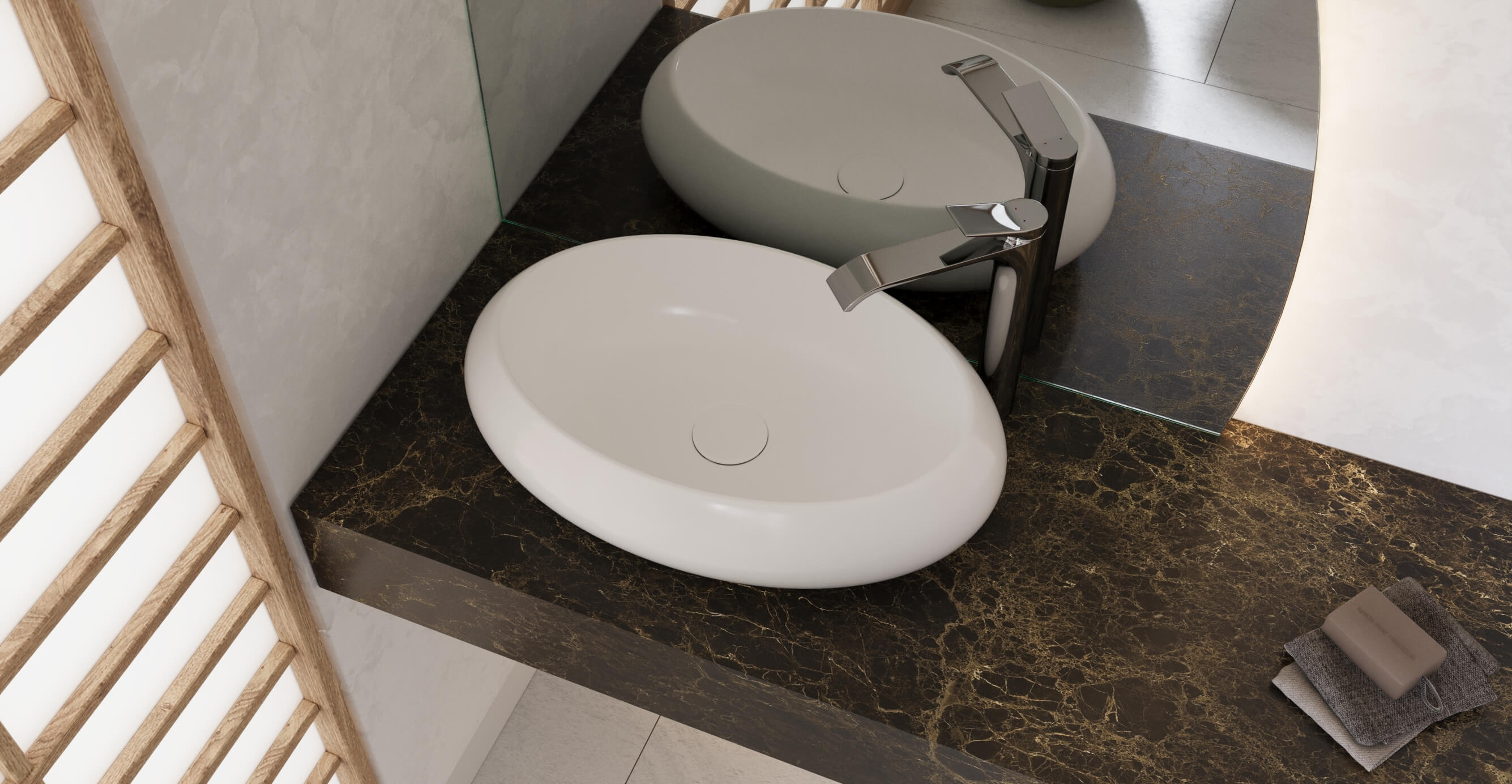 Покрыта керамикой итальянского бренда Laminam толщиной 3,5мм. Обладает великолепными эксплуатационными свойствами и делает акцент наприродные материалы используемые в модели. |