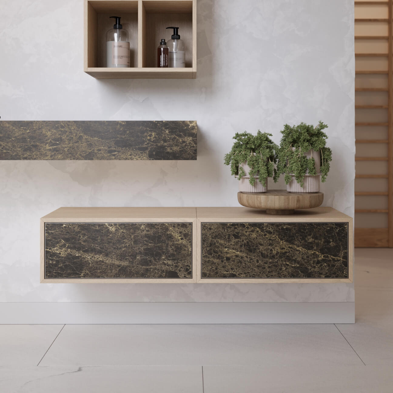 Такая тумба не только украсит ванную комнату, но и обеспечит удобство и практичность в повседневной жизни. Просторные ящики и полки позволят удобно хранить все необходимые мелочи и аксессуары для ухода за собой. Кроме того, легкость ухода за поверхностью и долговечность материалов делают эту тумбу отличным выбором для современного интерьера.