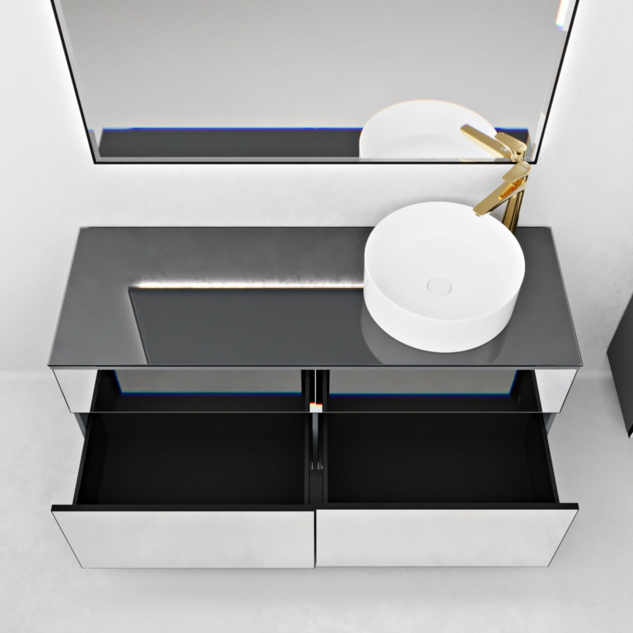 Вставки из зеркала «Pilkington» добавляют тумбе изысканности и загадочности. Зеркало «Pilkington» известно своим качеством и прозрачностью, что создает впечатление легкости и пространства. Благодаря зеркальным вставкам тумба приобретает шпионский шарм, придавая интерьеру загадочность и интригу.