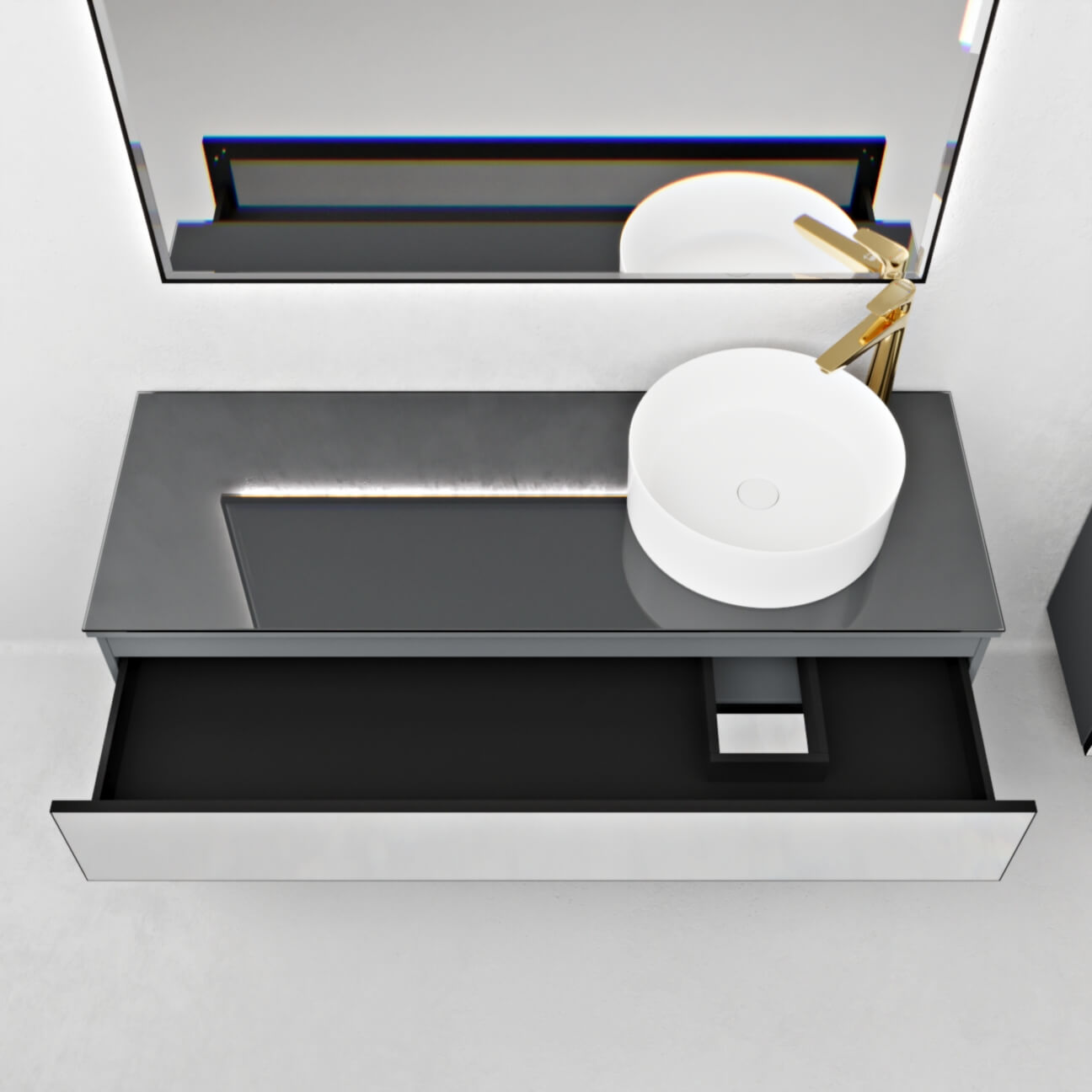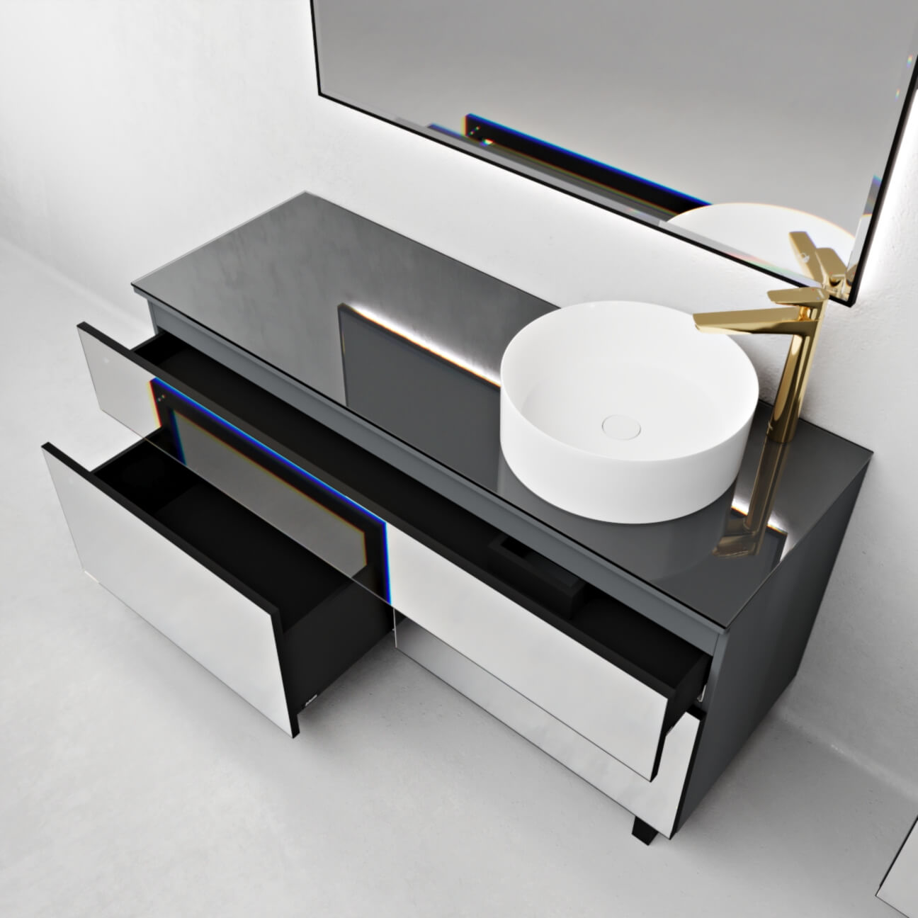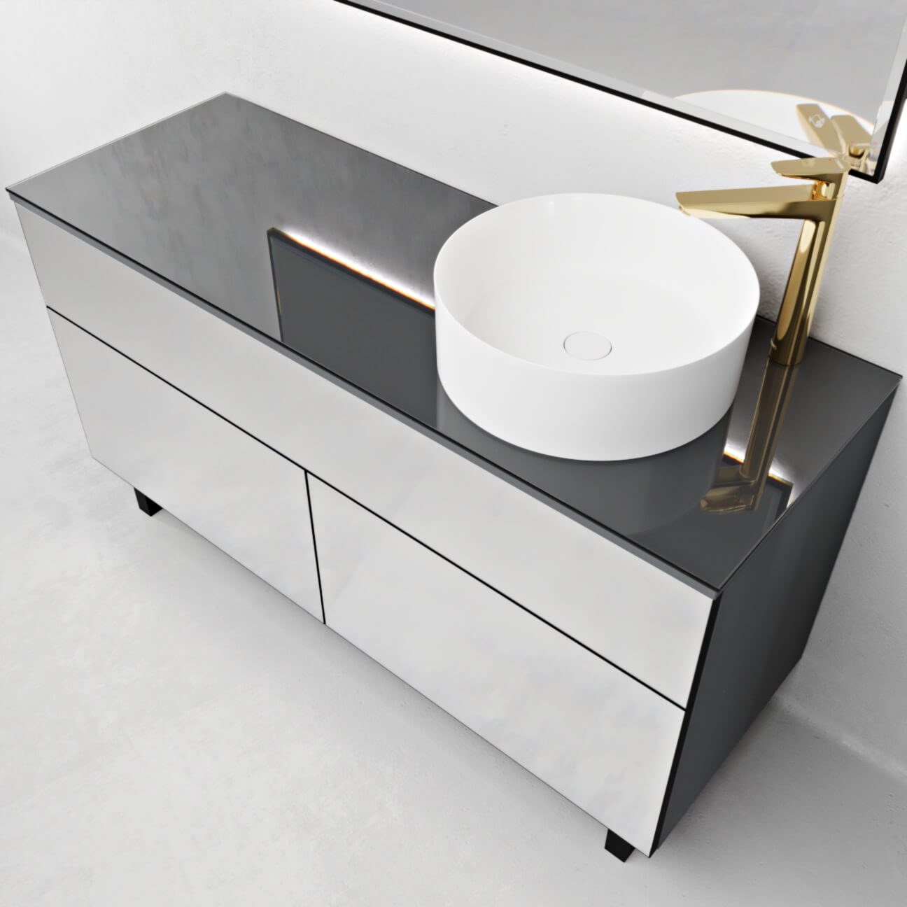 Тумба под раковину Fresco -Модель в современном стиле. Фасады из аллюминиевого профиля со вставками из зеркала «Pilkington».
